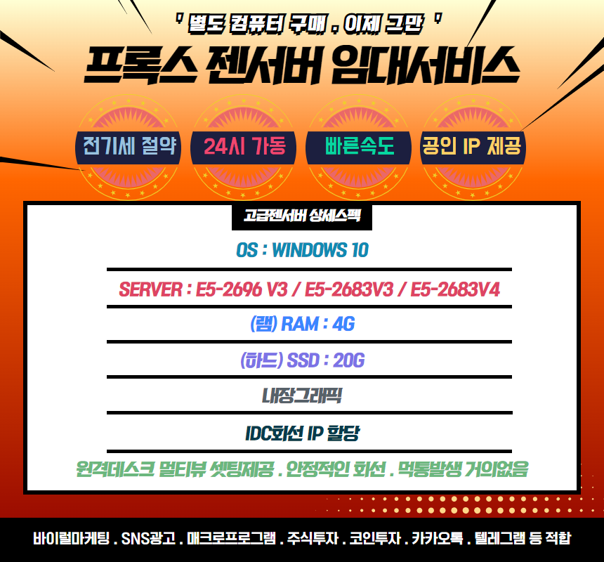 프록스 젠서버임대 기간:30일 사용기준 (10대 셋팅 / RAM 4G / SSD 20G)) (+50,000원)
