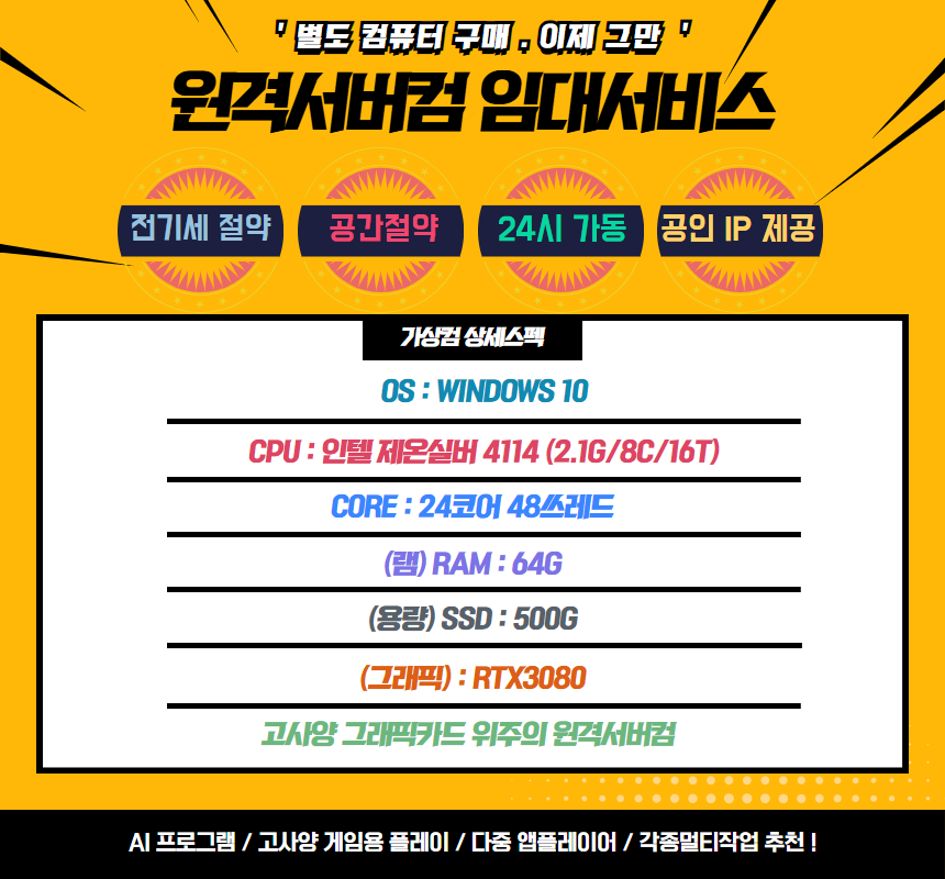 월 임대형:30일 사용기준 (제온실버 4114 / RAM 128g / SSD 500g / RTX 3080) (+0원)